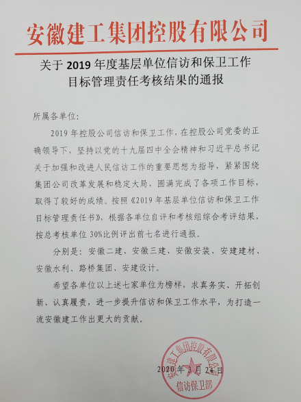 安徽二建信訪保衛(wèi)工作在公司黨委的正確領導下,圓滿完成了2019年度的各項工作任務。在集團信訪保衛(wèi)部組織的《2019年基層單位信訪和保衛(wèi)工作目標管理責任書》考核評比中榮獲第一名。